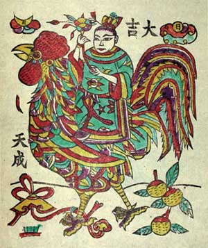 古时春节在门窗上画鸡来驱鬼怪邪气。晋朝人著的《玄中记》里讲到了前面说到的度朔山上的这只天鸡,说是当太是刚刚升起,第一道阳光照到这株大树上时,天鸡就啼鸣了。它一啼,天下的鸡就跟着叫起来了。所以春节所剪的鸡,其实就是象征着天鸡。然而古代神话中还有鸡是重明鸟变形的说法。据说尧帝时,过方的友邦上贡一种能辟邪的重明鸟,大家都欢迎重明鸟的到来,可是贡使不是年年都来,人们就刻一个木头的重明鸟,或用铜铸重明鸟放在门户,或者在门窗上画重明鸟,吓退妖魔鬼怪,使之不敢再来。因重明鸟样类似鸡,以后就逐步改为画鸡或者剪窗花贴在门窗上,也即成为后世剪纸艺术的源头。我国古代特别重视鸡,称它为“五德之禽”。《韩诗外传》说,它头上有冠,是文德;足后有距能斗,是武德;敌在前敢拼,是勇德;有食物招呼同类,是仁德;守夜不失时,天明报晓,是信德。所以人们不但在过年时剪鸡,而且也把新年首日定为鸡日。